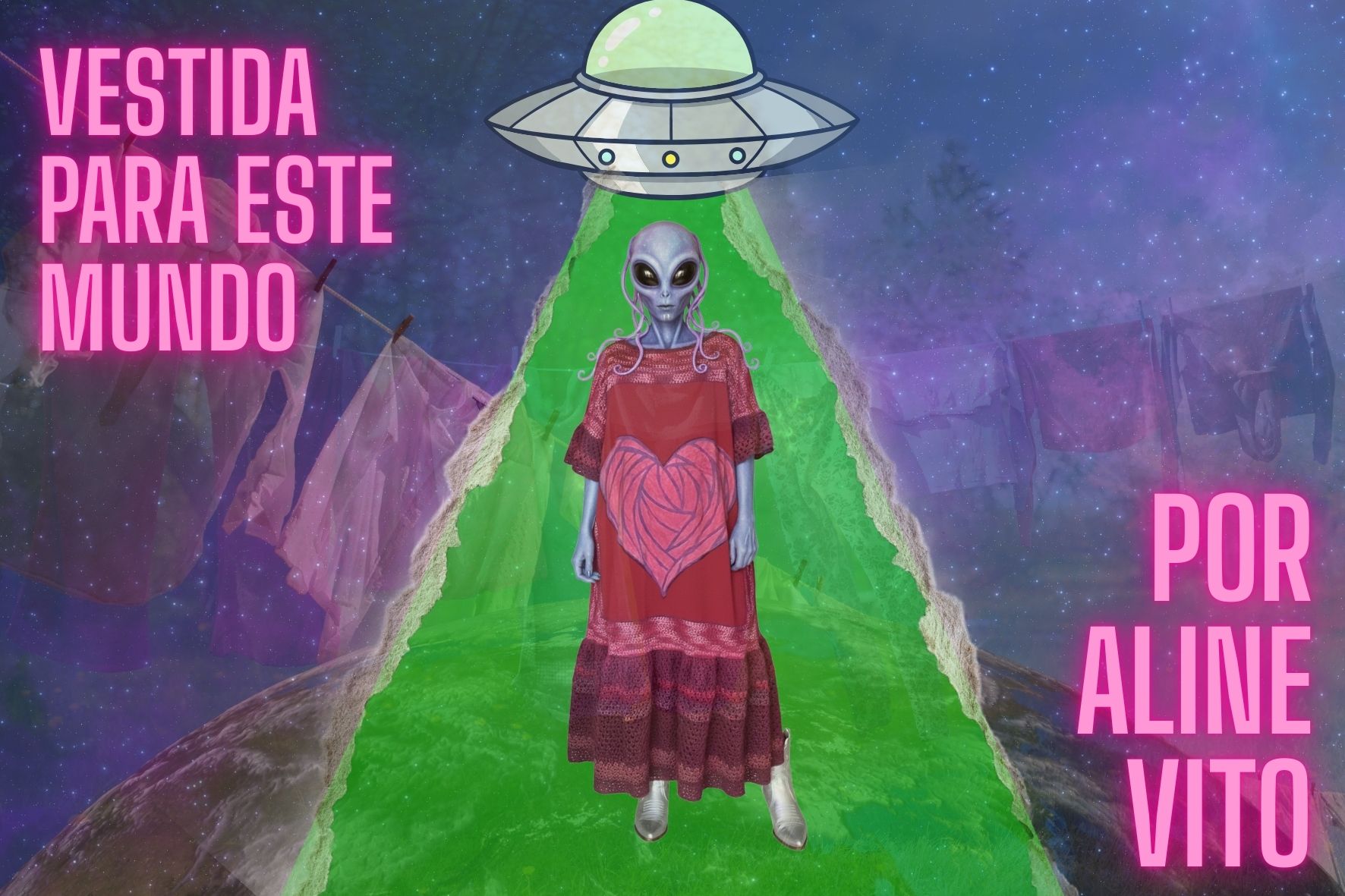 A paleta é intensa e afetiva — vermelhos, roxos, rosas e laranjas — cores que vibram como planetas próximos, carregando calor, energia e a força simbólica das histórias contadas ao pé da cama ou no interior de uma nave inventada. Sobreposições, texturas e acabamentos artesanais constroem peças que convidam o corpo a habitar um espaço de sonho e liberdade, onde o real e o extraterrestre se confundem.